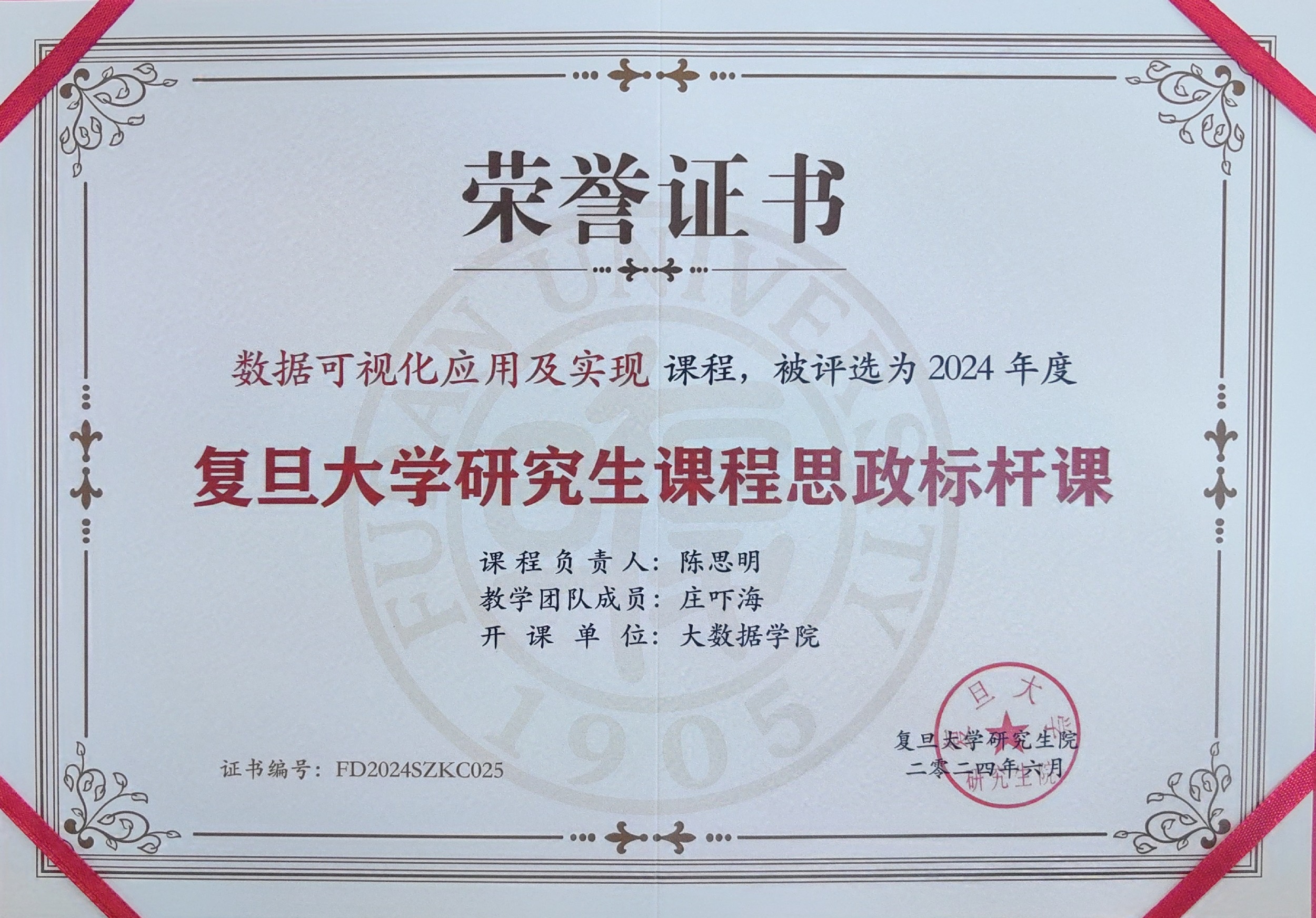 ▲《数据可视化应用及实现》被评为复旦大学研究生课程思政标杆课程