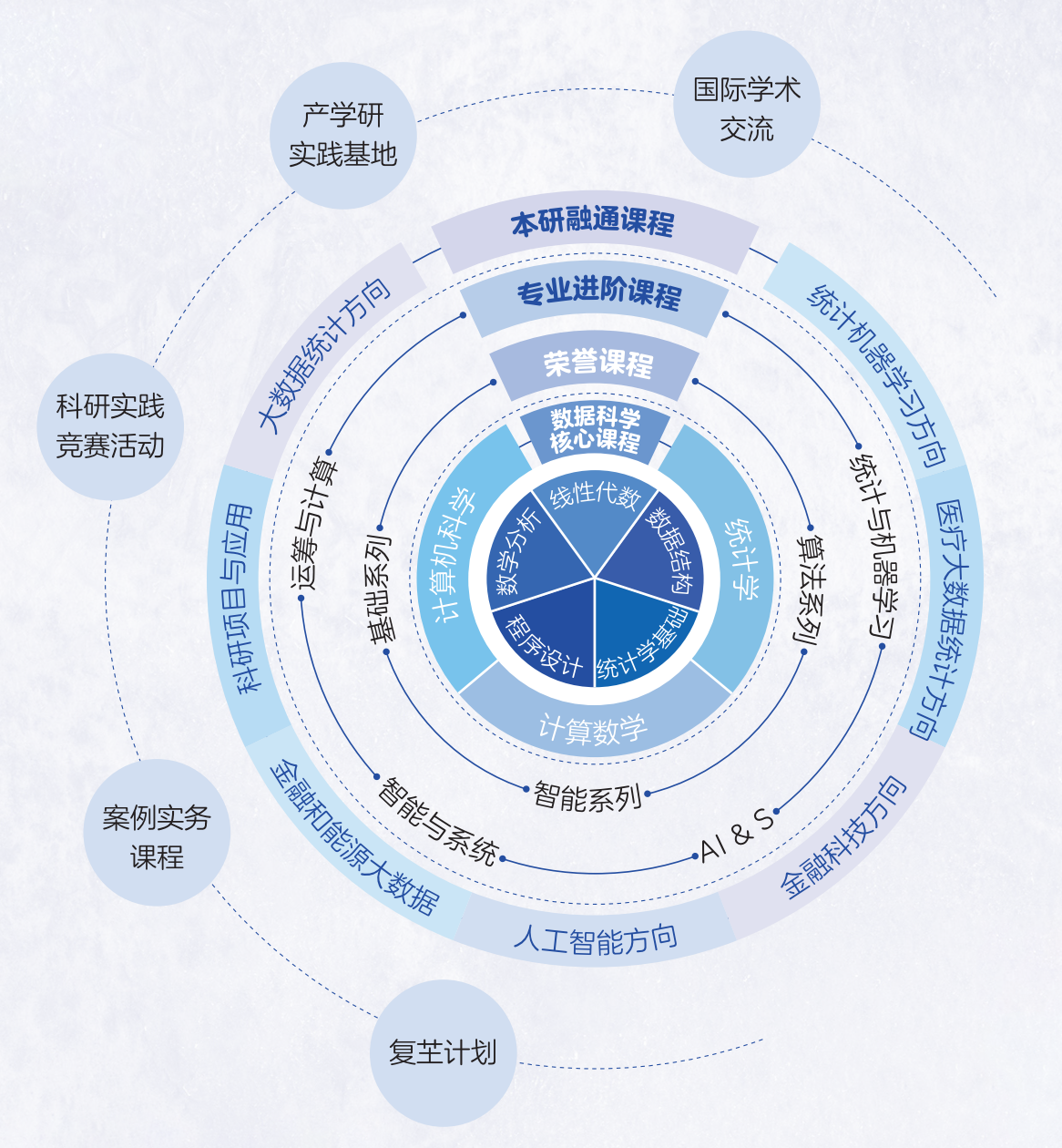 对标国际化人才培养方案和国际顶尖课程体系,设立“数据科学与大数据技术”全英文项目,致力于培养具有全球竞争力的复合型人才。项目以国际化课程设置、跨文化学术交流为特色,使学生掌握数据科学前沿技术的同时,具备在多元文化环境中协同创新的能力。项目聚焦计算数学、统计学、计算机科学与行业应用的交叉融合,鼓励学生参与国际科研合作与产业实践。