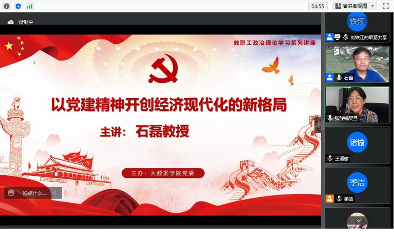 6月21日下午,由大数据学院党委主办的教职工政治理论学习讲座在线举办。此次学习讲座特邀复旦大学教授,公共经济与政策研究中心主任,教育部财政学教学指导委员会委员,教育部“国家精品课程教学名师”,中央广播电视总台《经济之声》特约评论员石磊同志,进行《以党建精神开创经济现代化的新格局》为主题的报告。本次讲座由大数据学院党委书记张骏楠主持,大数据学院、类脑智能科学与技术研究院、大数据研究院全体教职工和学生党员代表参加了本次学习。